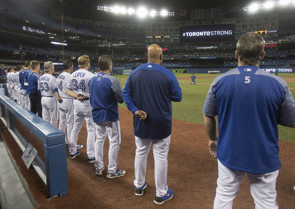 A blue banner reading “#TORONTOSTRONG” was hung from the second deck in centre field, and similar signs were hung on the wall behind home plate.