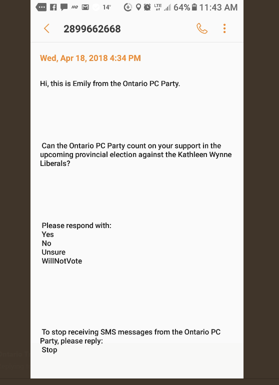 Many of the text messages accessed by CKWS follow the same pattern, and several are signed by a person who also calls herself Emily, who asks if the Ontario PC party can count on the receiver’s support in the June 7 provincial election against Kathleen Wynne’s Liberals.