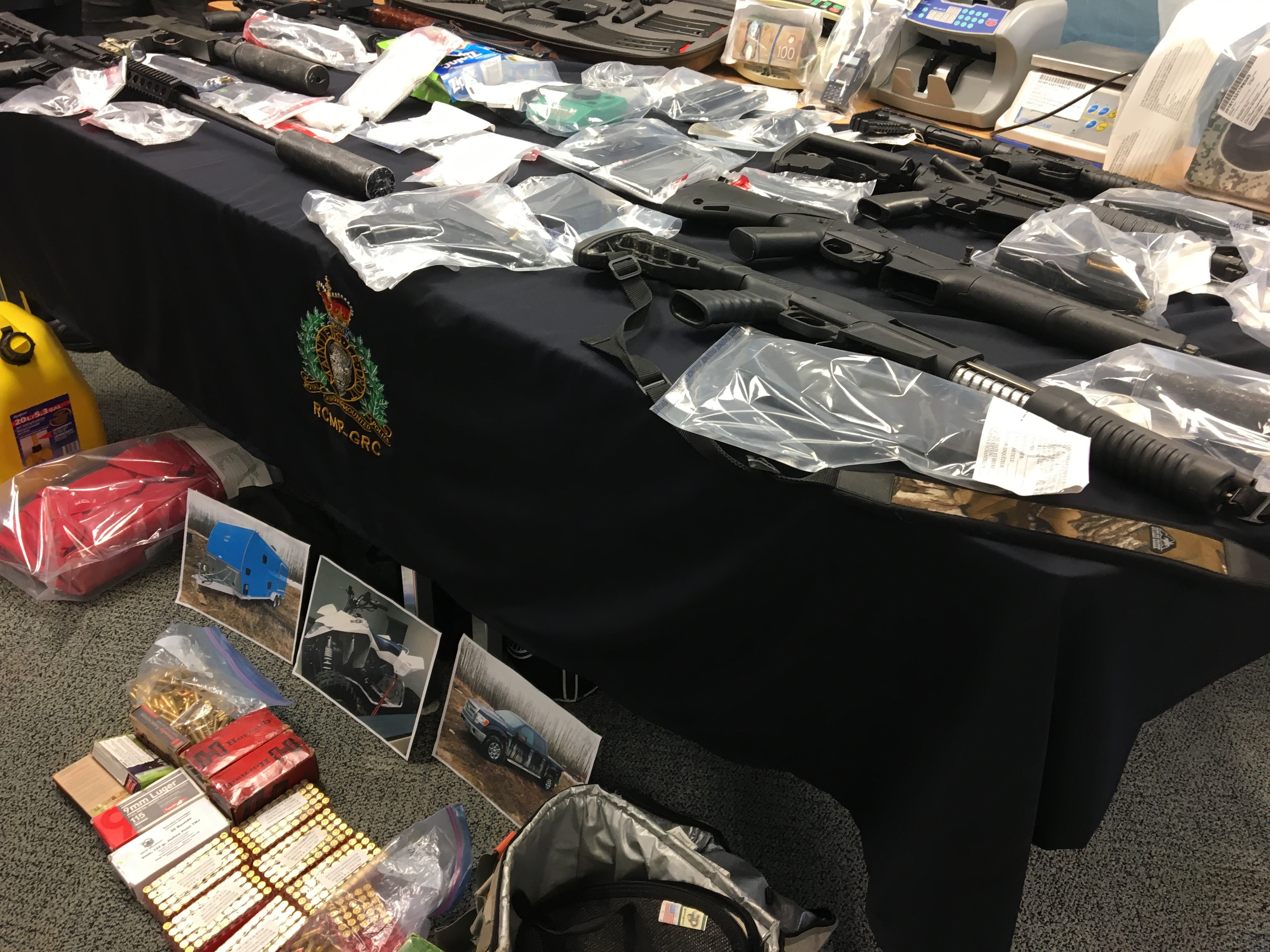 RCMP seized firearms — including a sub-machine gun fitted with a suppressor, a .40-calibre carbine with a high-capacity drum magazine, two semi-automatic non-restricted rifles and an AR-15 style rifle fitted with a suppressor, as well as several drugs, including 18 grams of cocaine, 75 grams of meth and 21 litres of GHB, plus $10,000 in cash and stolen vehicles.