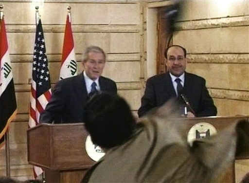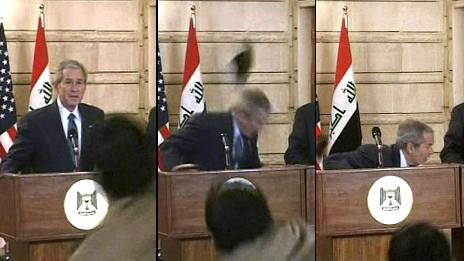 “This is a farewell kiss from the Iraqi people, you dog,” al-Zaidi yelled as he tossed the shoe before being pinned to the floor by security personnel. “You killed the Iraqis!”