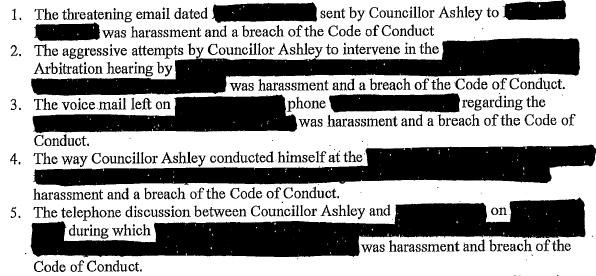 Ashley was suspended for 90 days from his duties on council, is barred from contacting anyone at the council during this period and must attend training pertaining to the areas of alleged misconduct.