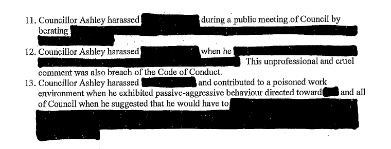 In the meeting’s minutes, the council calls Ashley’s behaviour “threatening and aggressive, as well as demeaning and belittling.”