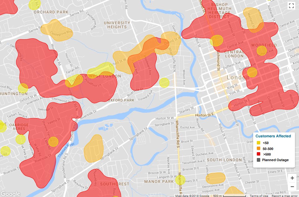 Throughout the afternoon, 980 CFPL received numerous reports of downed trees and power lines, some blocking roadways, and a significant amount of power outages.