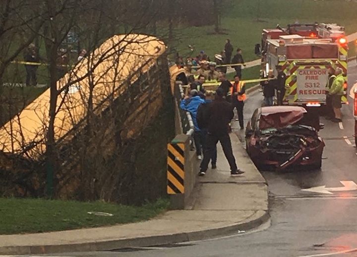 No injuries were reported after a school bus carrying students collided with two other vehicles in Bolton and ended up partially in a ravine.