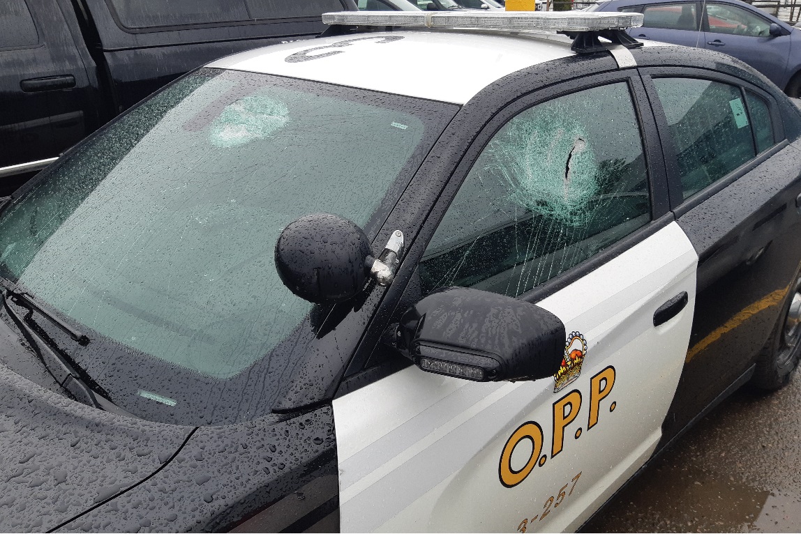 On Thursday morning, police were called to a business where an OPP cruiser had been left in a back parking lot between River Street and Hastings Street North. The windshield and driver’s side window was smashed.