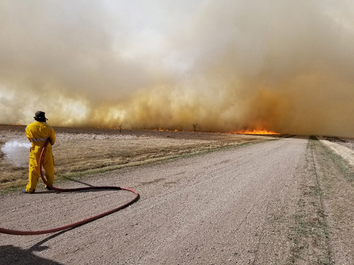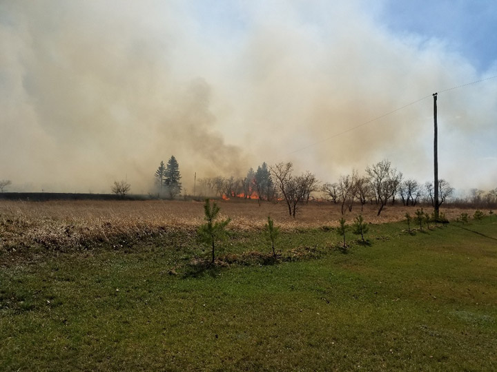 The grass fire, which was driven by 35 to 40 km/h wind gusts, quickly spread beyond the acreage and threatened three homes.