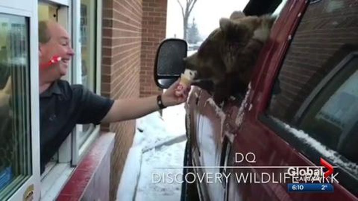 WATCH: Berkley the bear, a permanent resident of the Discovery Wildlife Park in Innisfail, Alta., eats ice cream from a vehicle in a Dairy Queen drive-thru in a video the wildlife park created as a warning against interacting with wildlife.
