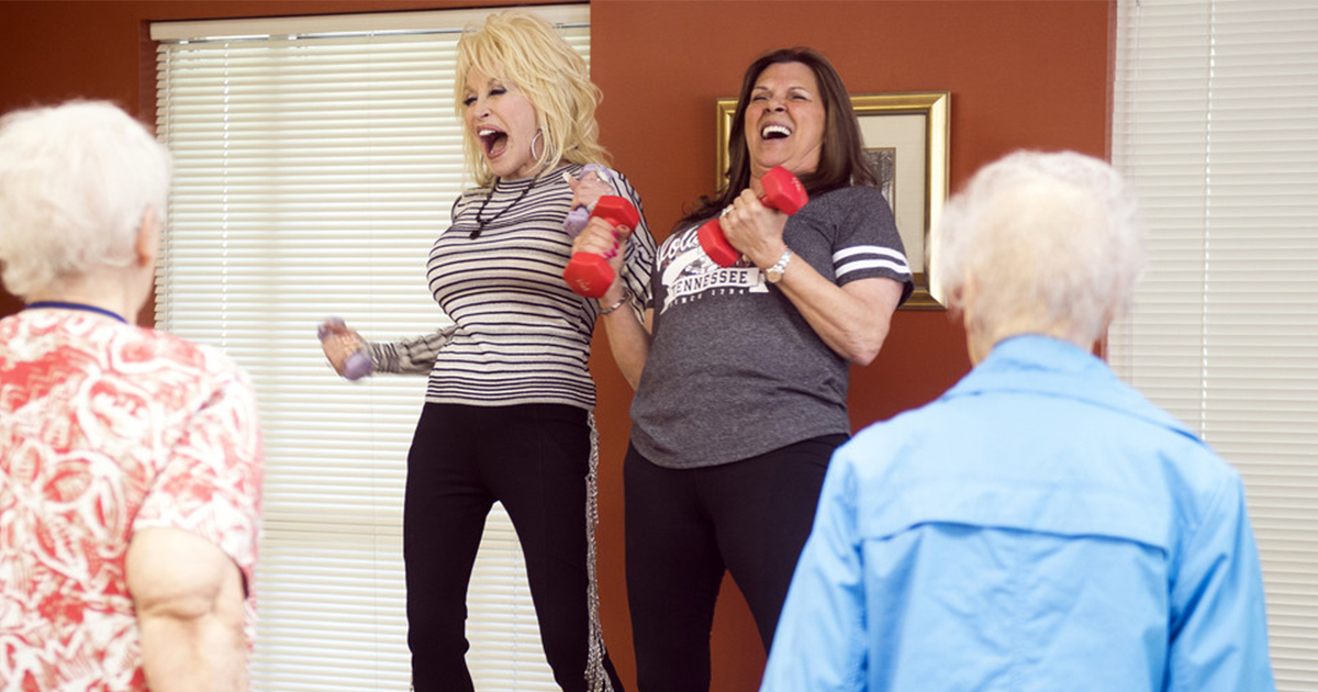 Country music superstar Dolly Parton paid a surprise visit to a senior centre in Sevierville, Tenn., where she sang, lifted weights and joked about her age.