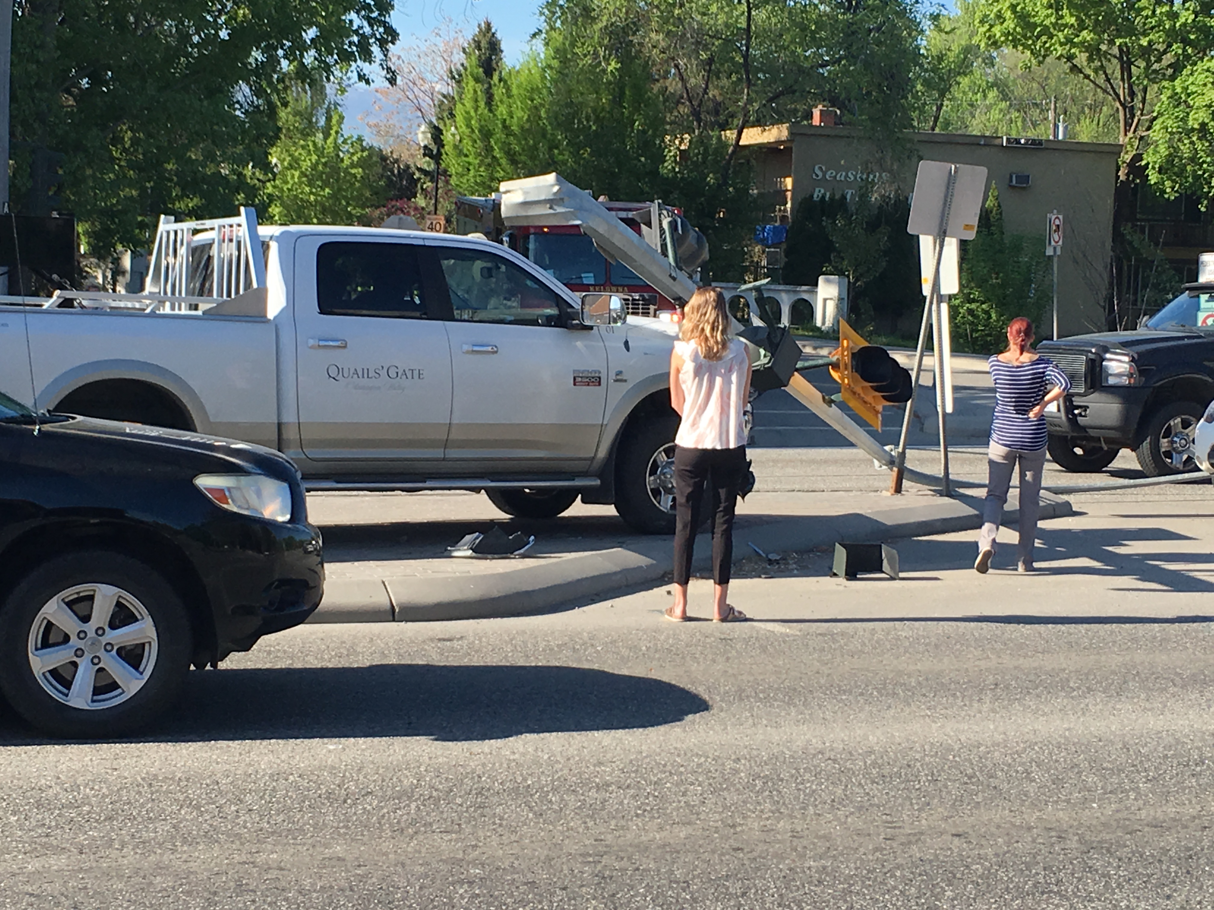 It happened early this morning at the intersection of Harvey Avenue and Abbot Street where a pick up truck towing a flatbed trailer struck a signal light standard, which landed on the truck.