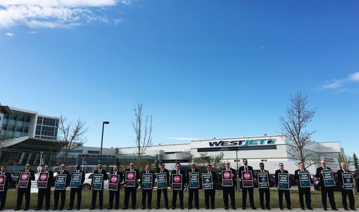 They carried picket signs but weren’t on strike. The WestJet pilots, along with some of their peers from competitor airlines, lined the sidewalk to show management they are serious about encouraging management to negotiate a fair contract.