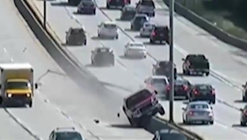 A pickup truck is seen driving in the left lane of Interstate 43 when it suddenly veers and mounts the highway divider.