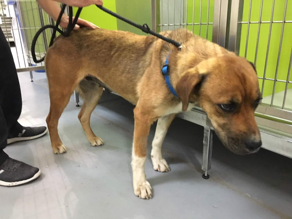 The dog believed to be the puppies’ mother was emaciated, her ribs seen clear as day through her coat of fur.