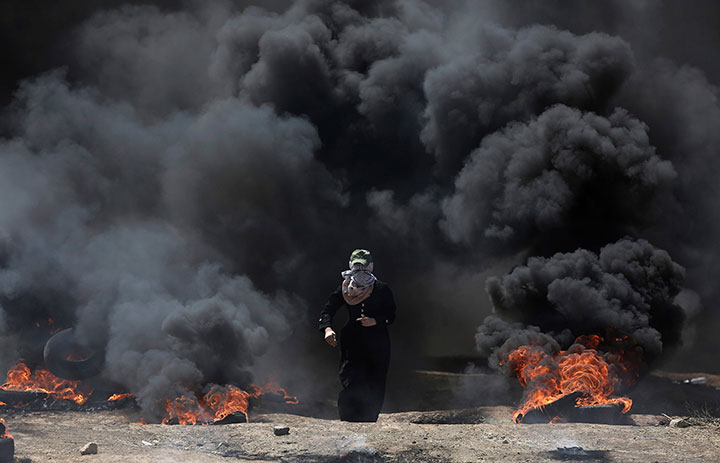 Throughout the day, Gaza protesters set tires ablaze, sending thick plumes of black smoke into the air, and hurled firebombs and stones toward Israeli troops across the border. The Israeli military, which has come under international criticism for using excessive force against unarmed protesters, said Hamas tried to carry out bombing and shooting attacks under the cover of the protests and released video of protesters ripping away parts of the barbed-wire border fence.