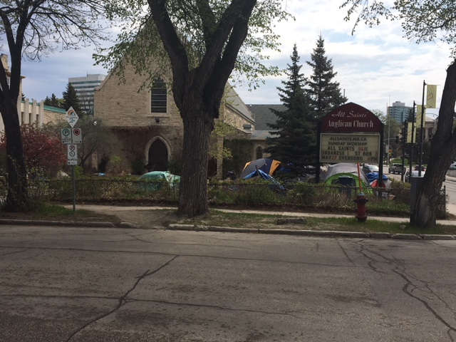 Dozens of homeless people have set up tents on the green space beside All Saints’ Anglican Church at the intersection of Broadway and Colony Street in Winnipeg.