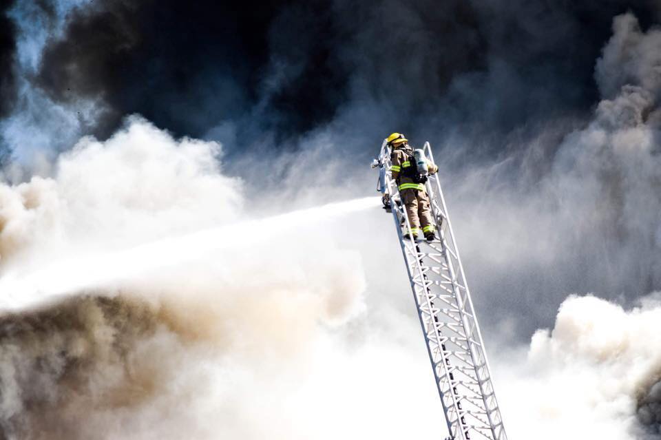 The fire was sparked at the Christie’s Office Plus building on Pacific Avenue just after 12 p.m. Saturday.