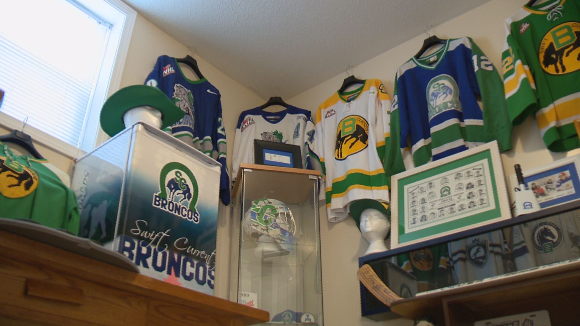 Sitting prominently in the corner of the room, joining a desk prominently displaying Broncos pucks – signed by each of the team’s 30 captains – and a dresser overflowing with team oddities, is a glass display case.