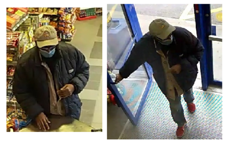 Surveillance footage shows the man wearing a beige baseball hat, black puffy jacket, tan button up shirt, light blue jeans and Nike running shoes. Police say he was also wearing a green hospital mask.