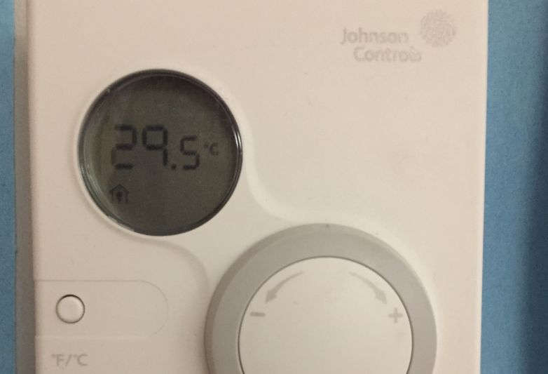 How hot is too hot? A photo taken in an Edmonton public school portable at around 9 a.m. Thursday shows a thermostat measuring a temperature of 28.5 C.