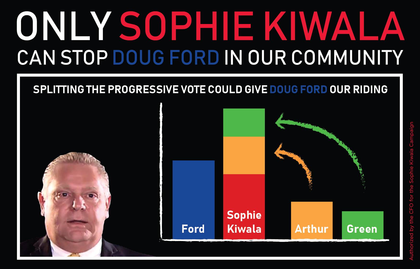 The implication of the ad was that having the progressive vote split between three parties may deliver a win to Ford’s PC party.