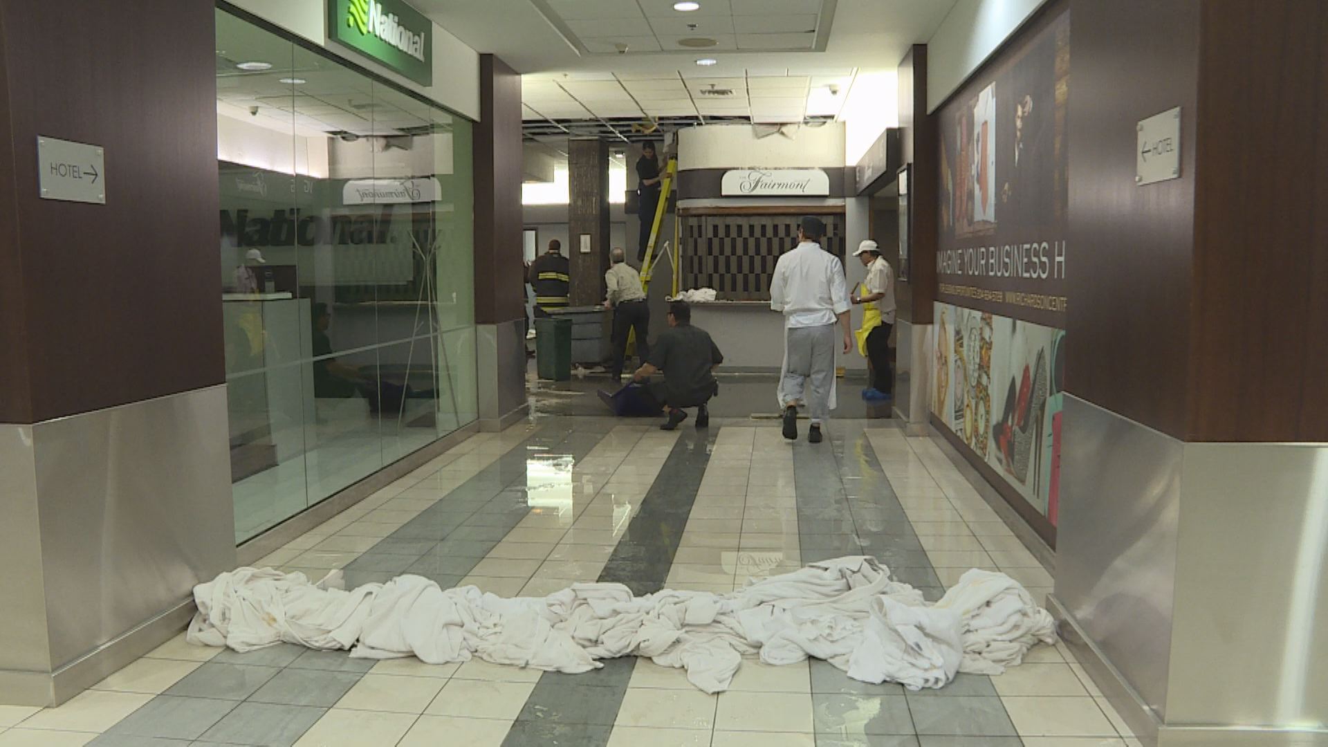 Heavy rains sent water pouring through the roof of the concourse underneath the Fairmont Hotel at Portage and Main.