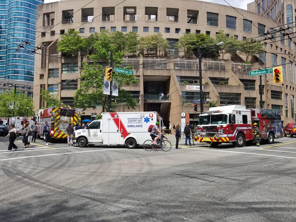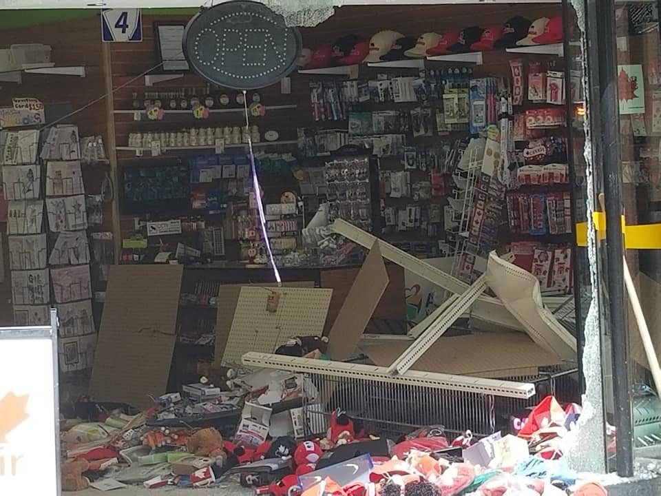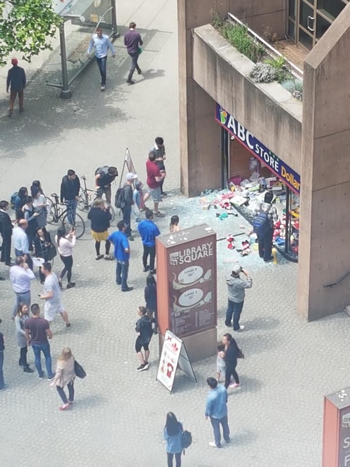 Police say just after 1:30 p.m., the driver was heading north on Hamilton Street towards Robson Street when they lost control, drove onto the northwest sidewalk and crashed through the ABC Dollar Store window.