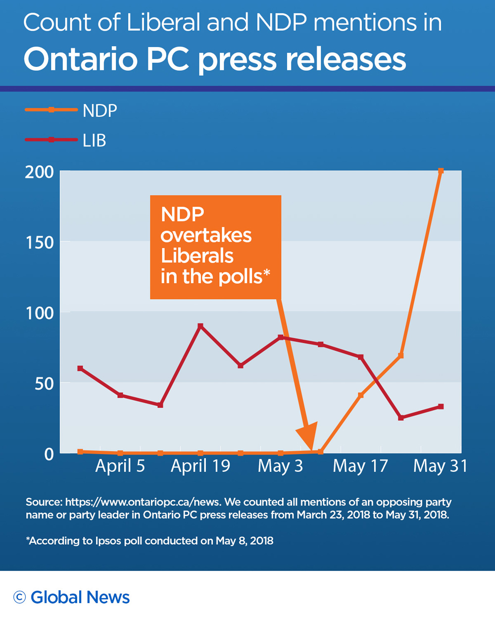 In early May, as polls showed Ontario voters shifting to the NDP, the Tory and Liberal campaigns turned to attacking them, a Global News analysis shows.