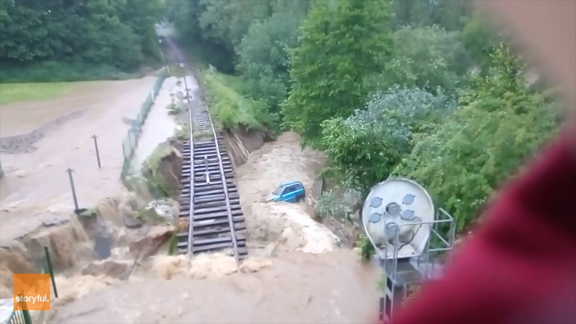 One video even shows a blue car being swept away by floodwater near Sainte Seve.