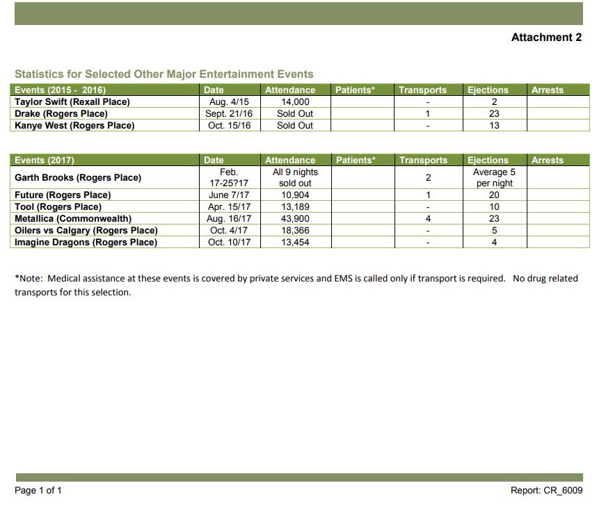 A Drake concert at Rogers Place in Edmonton in 2016 had just one hospital transport and 23 ejections, the report notes, while the nine sold-out shows by Garth Brooks in 2017 saw just two hospital transfers and an average of five ejections per night.