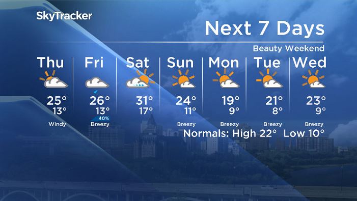 The second weekend of June and second last weekend of spring is a beauty. Saskatoon could top out at 30 degrees on Saturday with a ton of sun and very little cloud cover. That evening, temperatures will only drop to the mid teens. Normal overnight lows for this time of year are 10 degrees.
