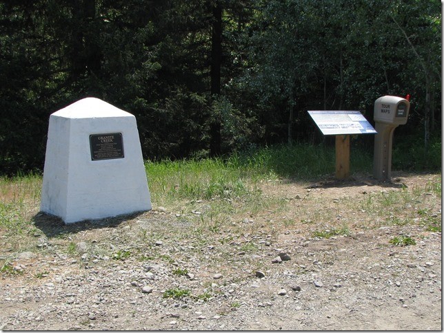 The self-guided tour starts at the cairn, and 10 interpretive signs display the history of Granite Creek. Tour maps are available in a mailbox showing the location of the signs, along with original buildings and remaining ruins.
