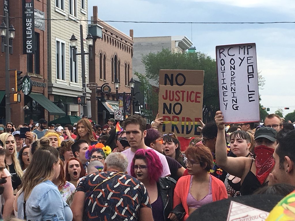 “A group of people of colour, trans and queer folks and their allies briefly held up the parade to bring more awareness to the fact that the Pride Society had unfortunately asked a lot of people of colour to march as marshals in the parade — which was great — but then when those folks brought their demands and their needs for their own safety to have the police and military, etc. not walk in the parade, those requests were ignored not once but twice,” spokesperson Alexis Hillyard said.