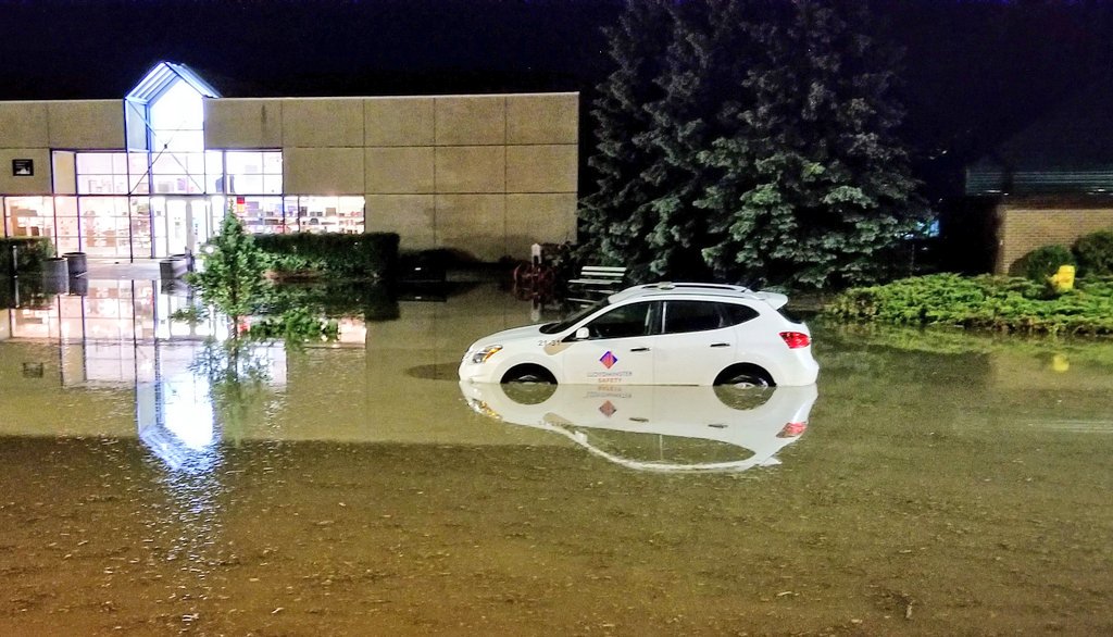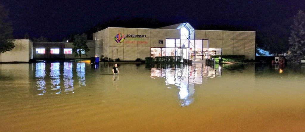 Choudhary Mansoor Azeem posted the photos below, showing water levels above the knee in the Lloydminster Cultural & Science Centre parking lot.