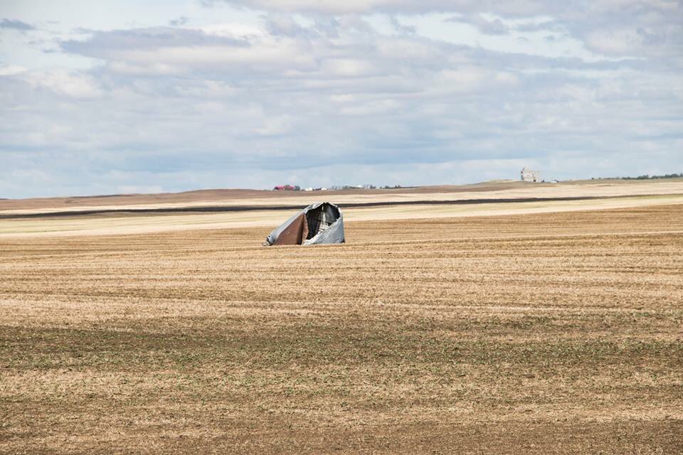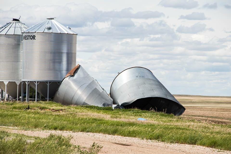 Grain bins were damaged and tossed by the strong winds on a farm near Laporte, Sask. Photos posted on Twitter also show damage to trees in Wilkie, Sask.