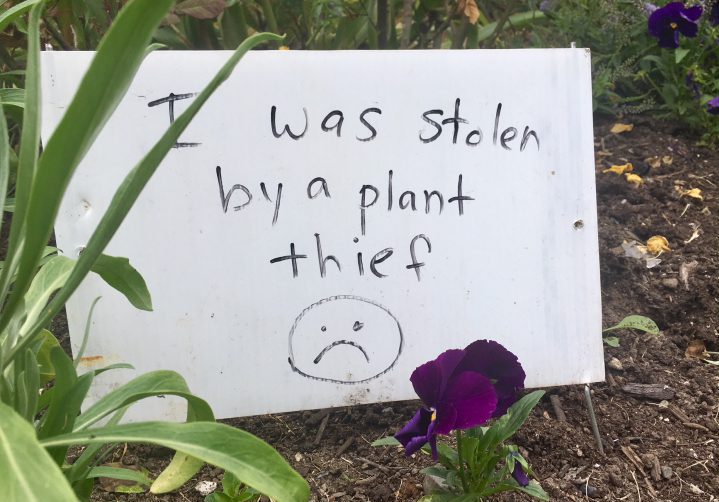 In their place, staff gardeners have put up signs that read, “I was stolen by a plant thief.”
