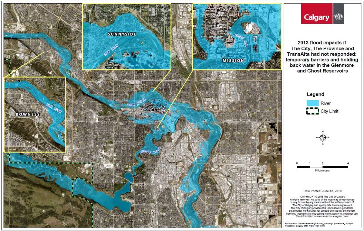 SEE BELOW: Maps from the City of Calgary show what the 2013 flood impact would have been with no response to control water flow, what did happen in 2013 and what it would look like if a similar flood happened after all mitigation and resiliency projects were completed.