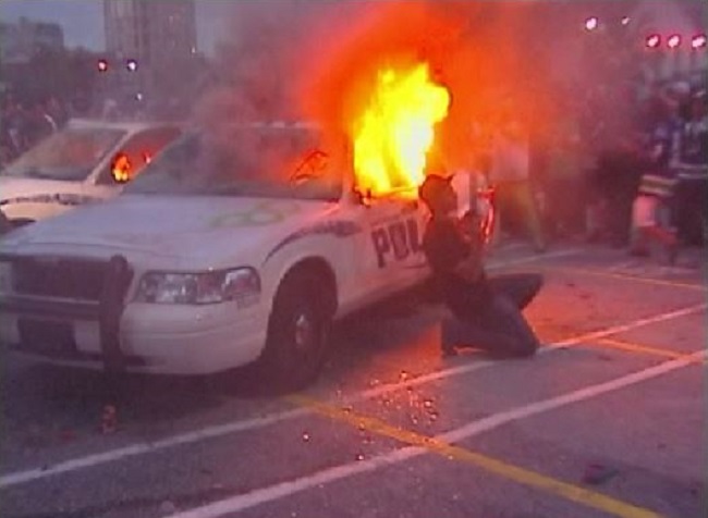 The mob flipped and burned cars, smashed windows, looted stores and attacked several people.