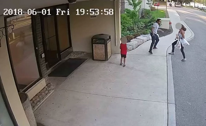 In an effort to identify and locate a suspect, Peel Regional Police have released a disturbing video appearing to show a woman being grabbed, pushed and hit as she was walking with a young child.