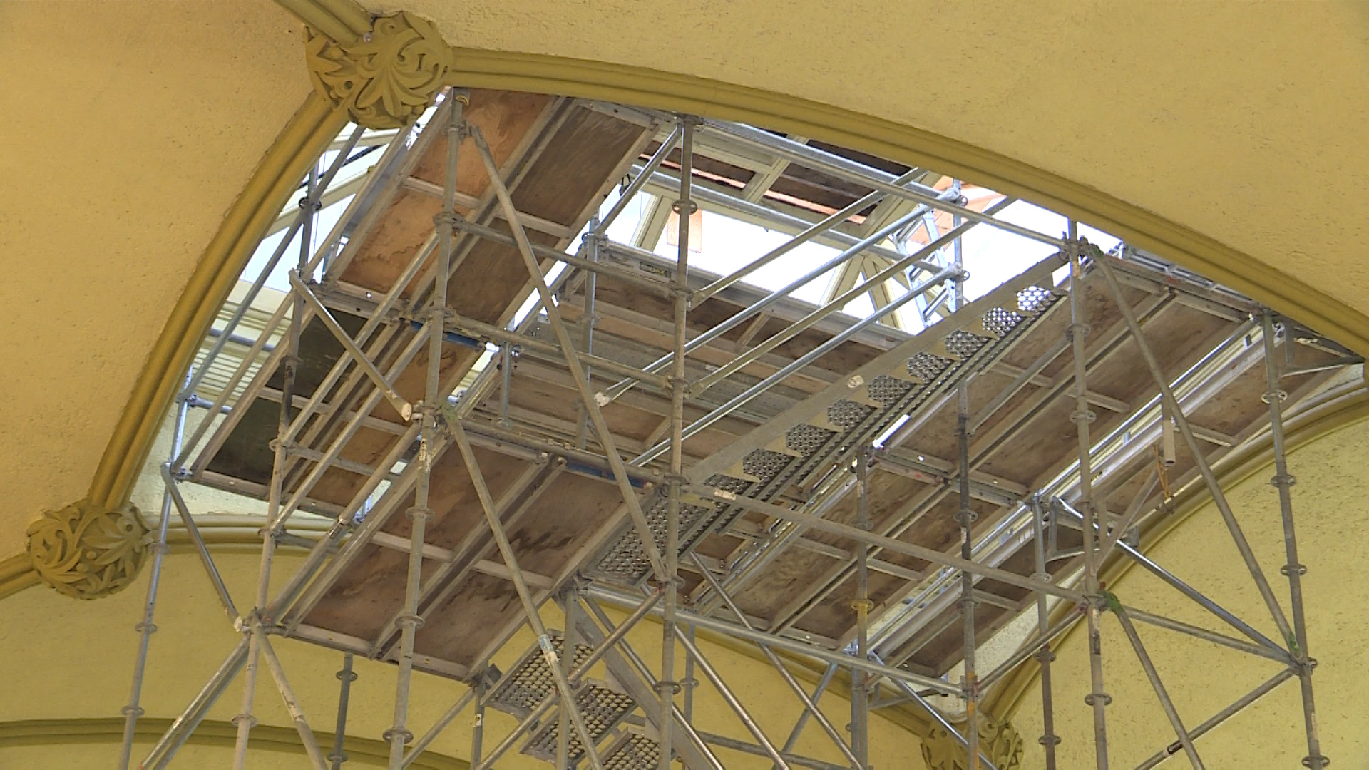 Between 35 and 40 feet up in the air, tucked underneath the cupola, where the ceiling workers have removed several stained glass windows. According to Mark Gray with the Ecclesiastical Refinishing Group, the windows haven’t been refurbished for over a century.