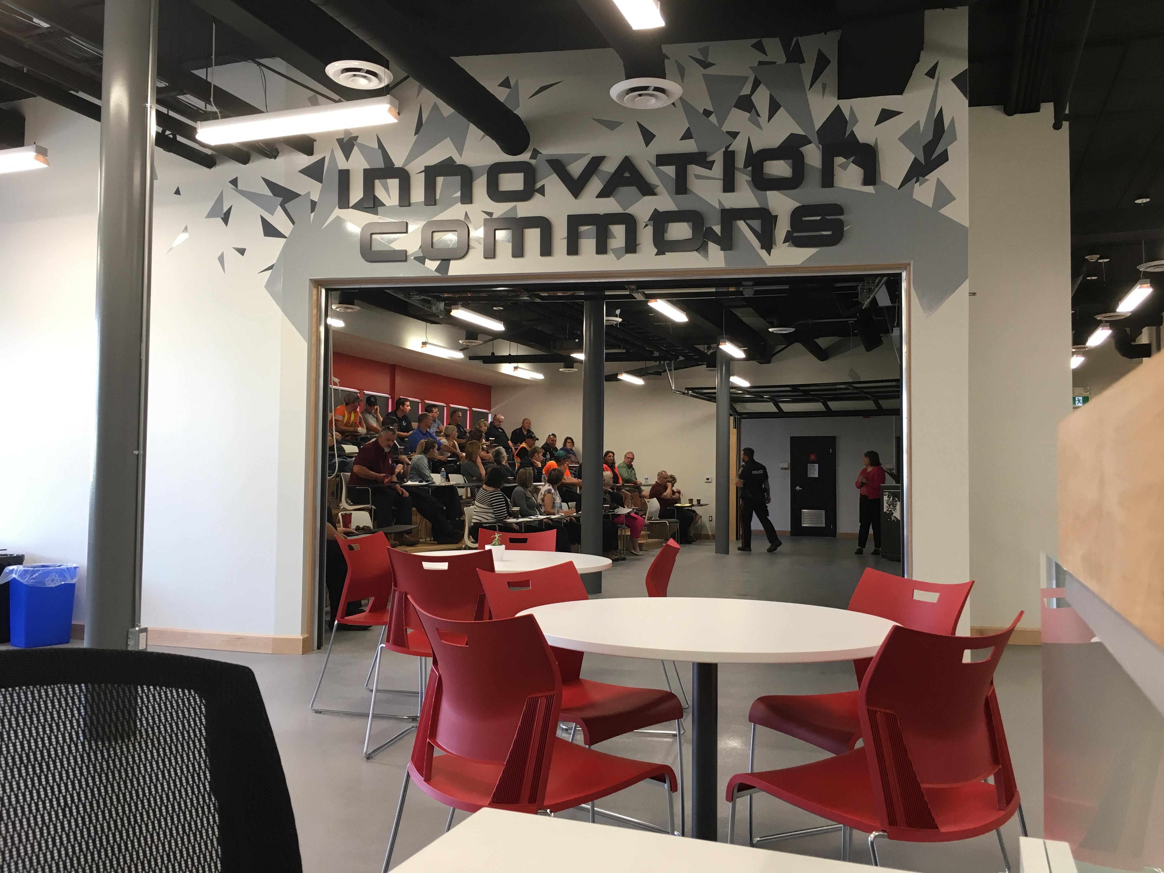 The 30,000 square foot building comprises three sections; an innovation commons, which is a space open to the community and public for rentals, a venture zone for startups to rent a private office or seat, and maker labs, where startups can work on prototypes.