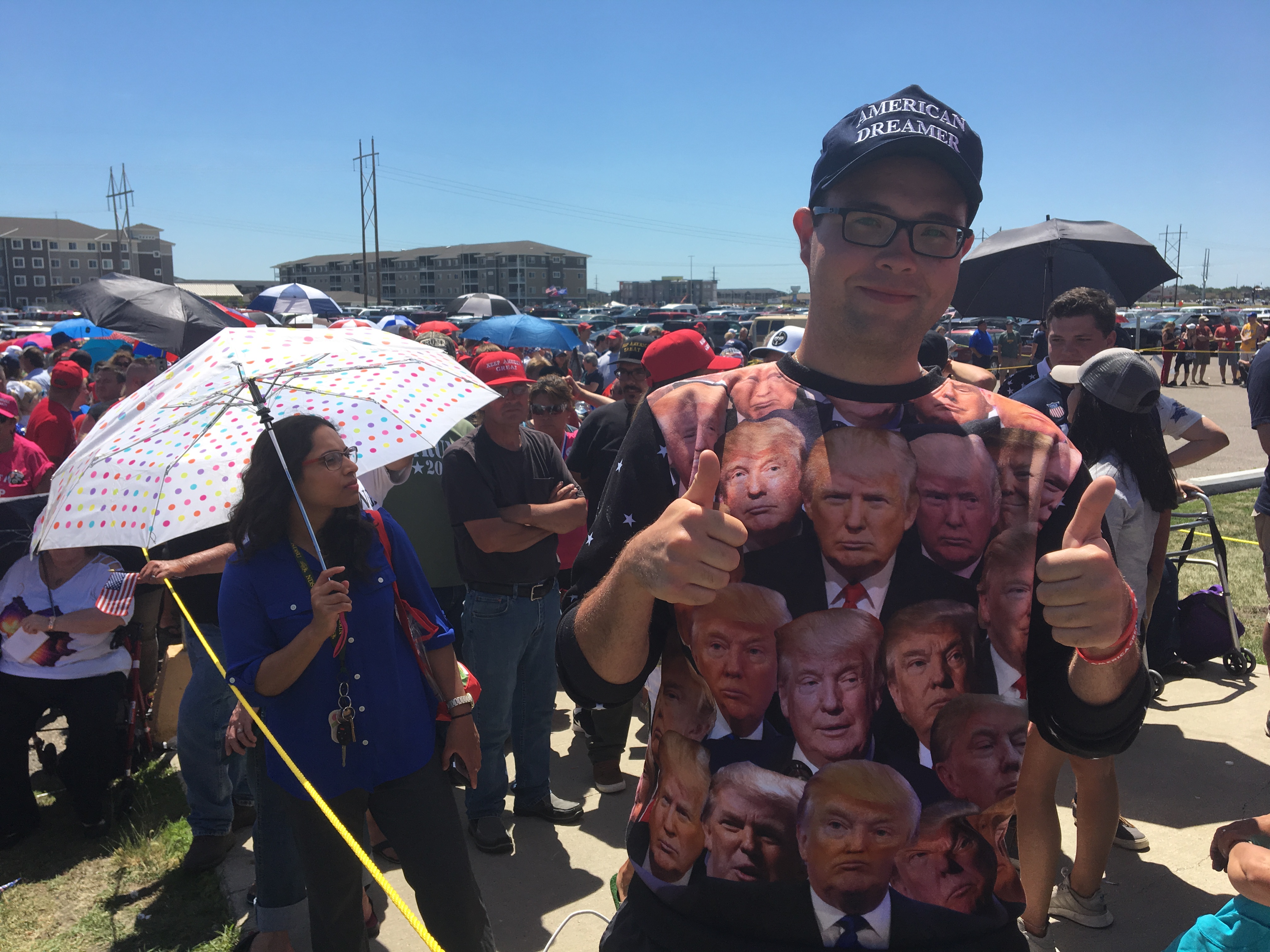 Stevens is one of about 5,000 Trump supporters who will pack into the Sheels Arena to catch a glimpse of their leader. Hundreds of red hats and signs could be spotted across a sea of supporters, but Stevens made sure he stood out with a sweatshirt paying ode to the President.