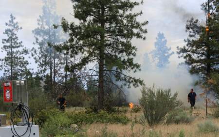 The Oliver Daily News reports that several trees were fully involved with flames moving through the grasslands.