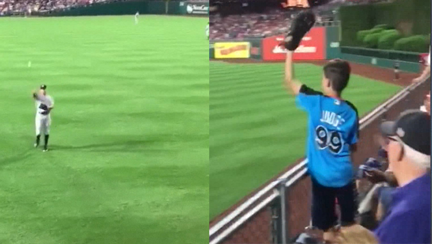 Video taken by another person in the stands shows a fan, James Payne, wearing a “Judge” jersey and baseball glove, tossing the ball out to the baseball superstar, who then catches it and tosses it back up to the boy.