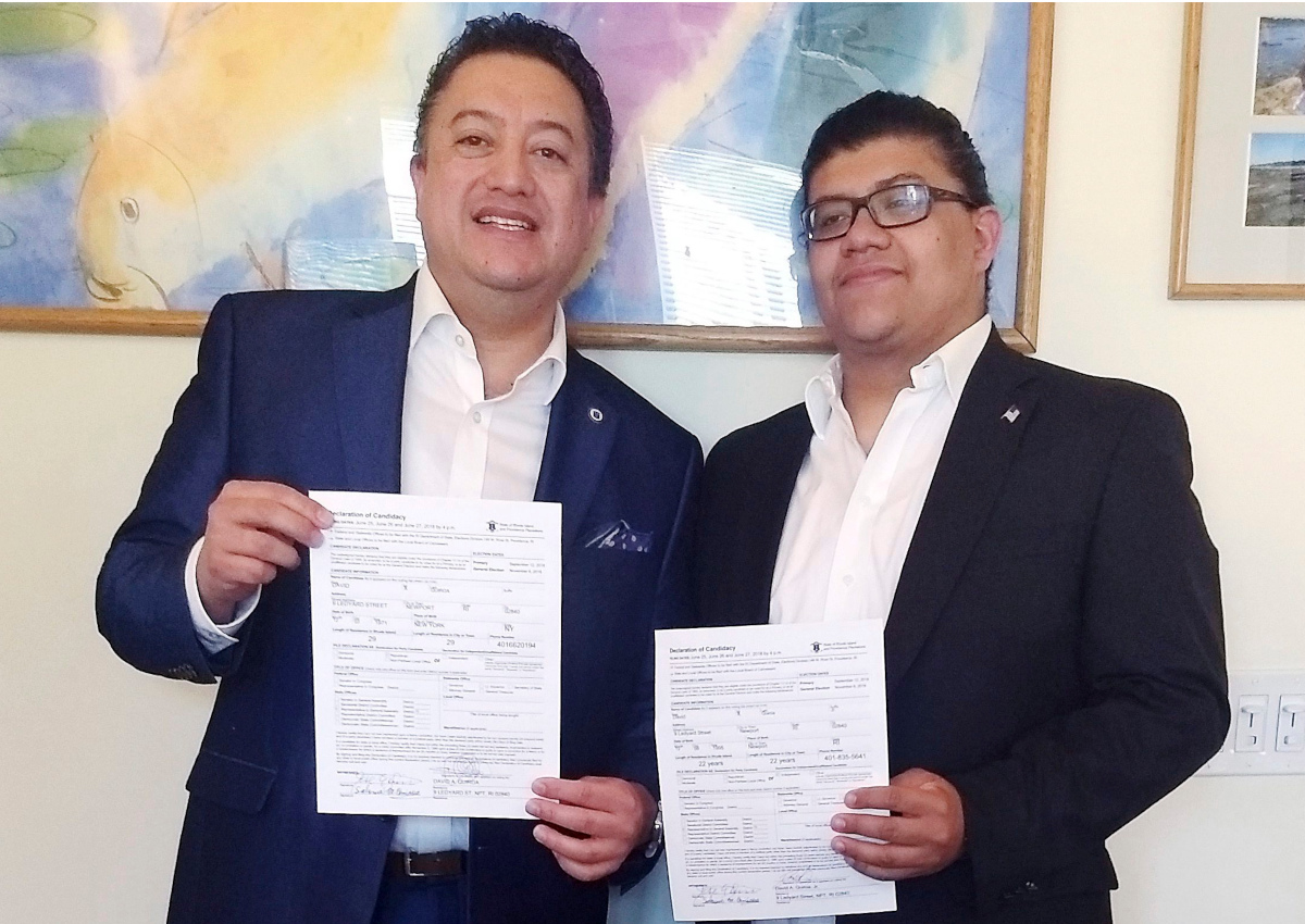 In this Tuesday, June 26, 2018 photo provided by David Quiroa, father David Quiroa, left, and son David Quiroa, Jr., right, hold their candidacy papers in Newport, R.I.