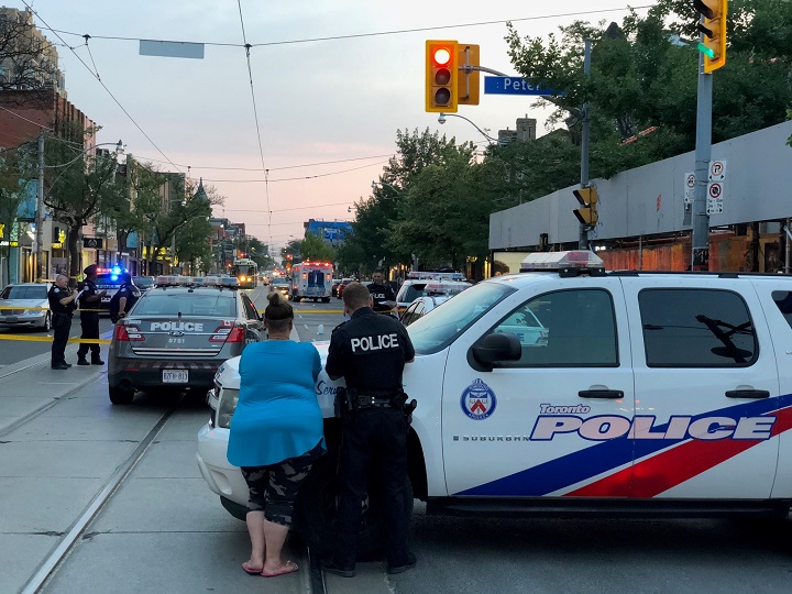 Toronto police said they were called to the area of Queen Street West near Peter Street with reports of gunshots fired on Saturday evening around 8 p.m.