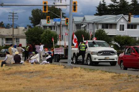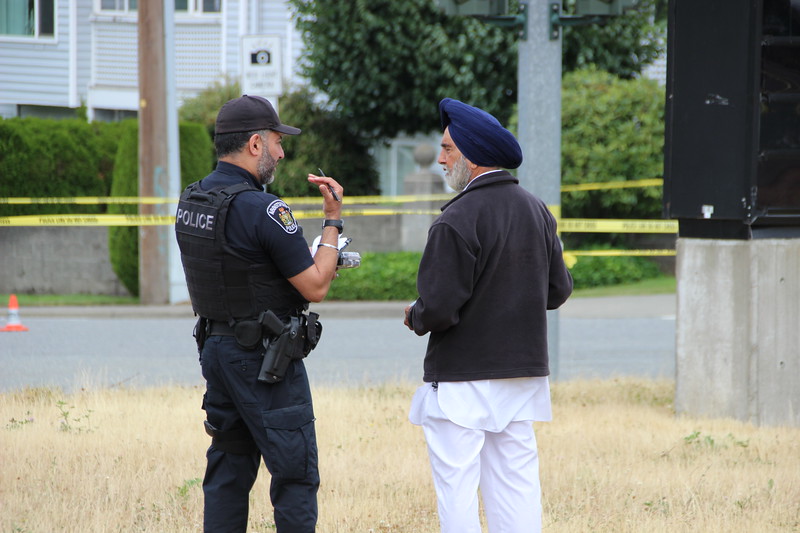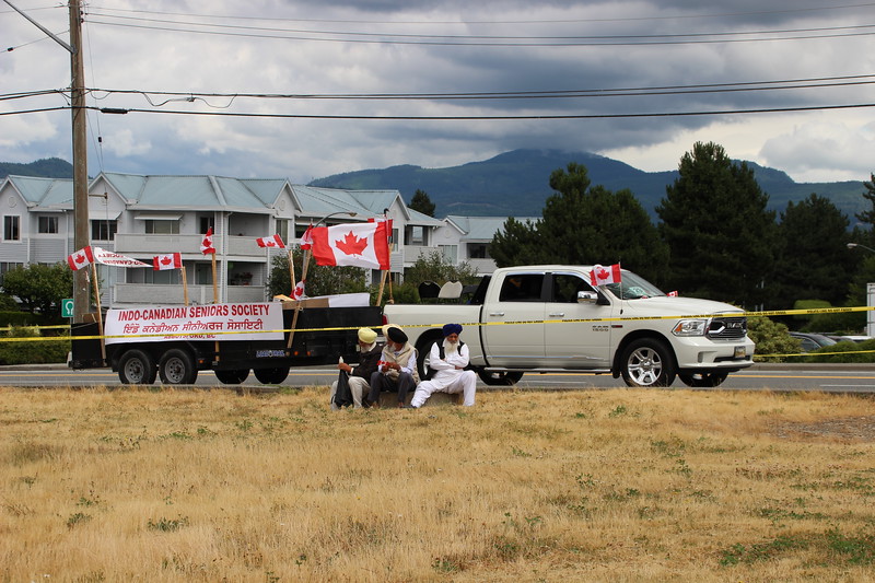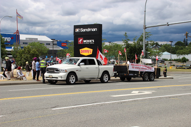 Photos from the scene show a Dodge Ram behind police tape, pulling a trailer covered in flags and a banner reading “Indo-Canadian Seniors Society.”