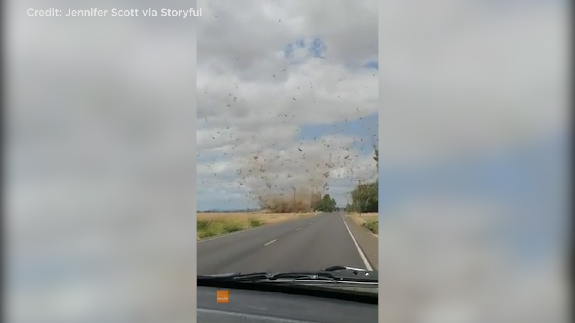 On Monday, Jennifer Scott was driving home with her children and one of their friends in Linn County, Oregon when they came across a dust devil. The dust devil, which had picked up hay on its path, made for a spectacular sight until it started approaching closer.