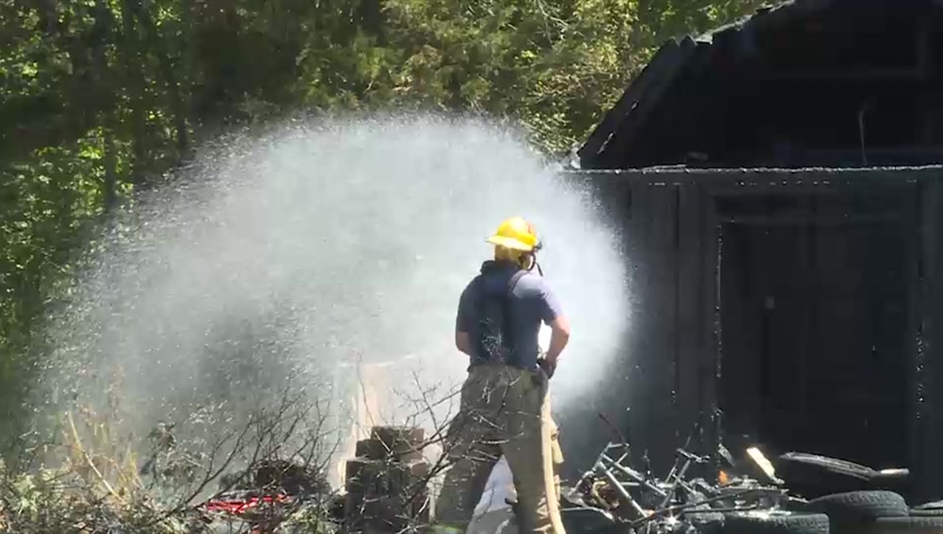 The aluminum siding of the main house on the property was damaged by the heat of the fire and Emergency Services cut down a large tree next to the shed as a forest fire precaution.