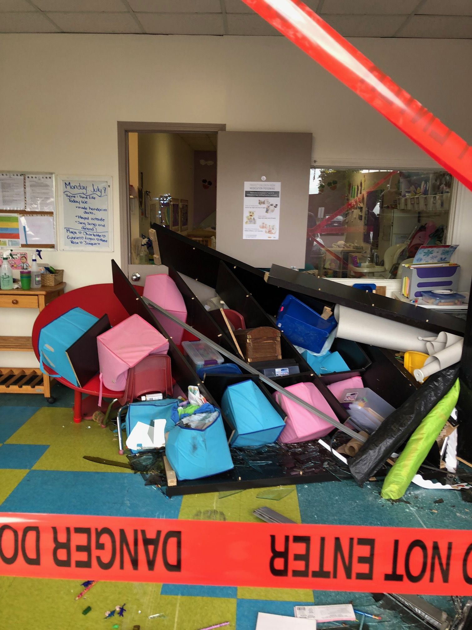 The front window of the building was completely smashed. Inside, desks, chairs and shelves were forced through the preschool children’s playroom to the back wall of the building.