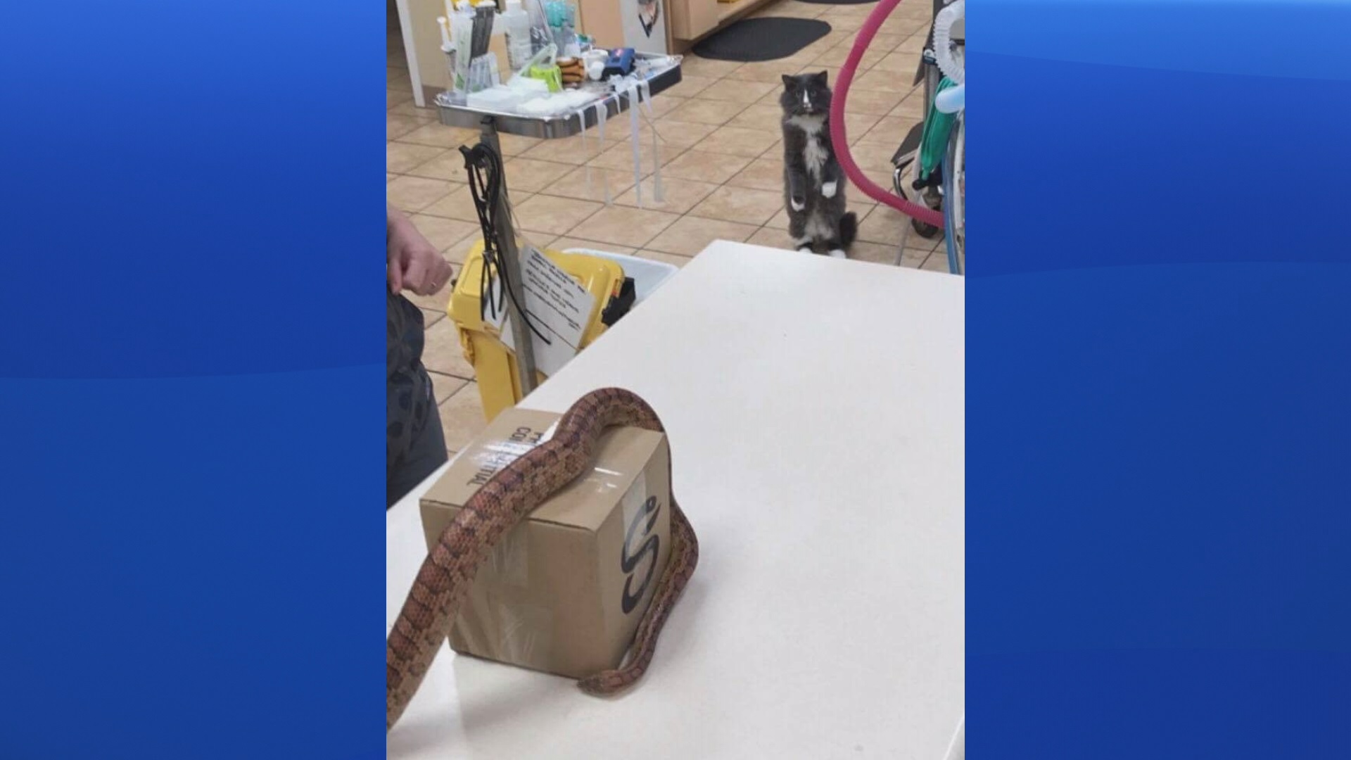 “He jumped up on the counter. He didn’t know [the snake] was there. Then he saw it and jumped down immediately,” said Lindsay MacKenzie, an assistant technician at the clinic.