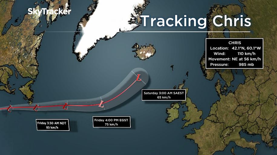 Environment Canada says Chris was about 372 kilometres southwest of Sable Island early Thursday morning and is expected to weaken into a post-tropical storm as it moves northeast and tracks over the southeastern tip of the Avalon Peninsula Thursday evening.